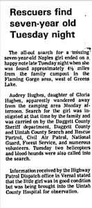 1979“Rescuer finds seven-year old Tuesday night”Audrey Hughs, daughter of Gloria Hughs, apparently wandered away from the camping area Monday afternoon.