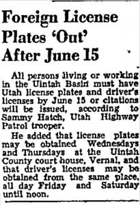 “Foreign license plates ‘out’ after June 15”All persons living and working in the Uintah Basin must have a Utah license plates and driver’s licenses by June 15 or citations will be issued, according to Sammy Hatch, Utah Highway Patrol Trooper.He added that license plates may be obtained Wednesday and Thursday at the Uintah County court house, Vernal, and driver’s licenses can be obtained at the same place all day Friday and Saturday till noon.