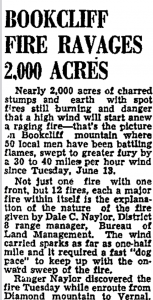 This week in History 6/22/1950“Bookcliff fire ravages 2,000 acres”Nearly 2,000 acres of charred stumps and earth with spot fires still burning and danger that a high wind will start anew a raging fire -- that’s the picture in Bookclifff mountain where 50 local men have been battling flames, swept to greater fury by a 30 to 40 mile per hour wind since Tuesday, June 13.