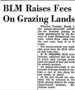 Effective Tuesday, March 1, the animal-unit month (AUM) fee for livestock grazing on lands administered by the Bureau of Land Management has been raised three cents of the past year from 30 to 33 cents.