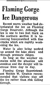 Recent warm weather had deteriorated the ice on Flaming Gorge Reservoir. Although the Ice is one to two feet thick on the Northern section it is becoming honeycombed with fine cracks which are rapidly weakening the ice.