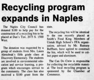 The Naples City Council has donated $100 to help pay for the construction of a recycling bin to be placed at Dan’s Tire, 2075 S 1500 West.