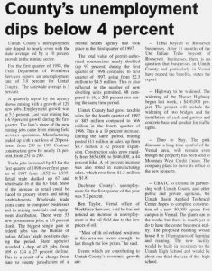 Uintah County’s unemployment rate dipped to nearly even with the state average led by a 10 percent growth in the mining sector.For the first quarter of 1998, the Utah Department of Workforce Services reports an unemployment rate of 3.8 percent for Uintah County.