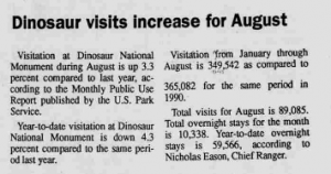 Visitation at Dinosaur National Monument during August is up 3.3 percent compared to last year, according to the Monthly Public Use Report published by U.S.