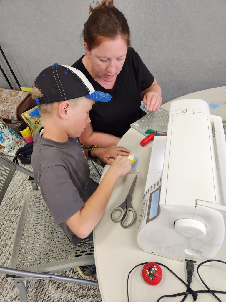 Amber Kleckar shows her son Kolby how to do a paper piecing during last Tuesday’s Kings Peak Quilt Guild meeting held at the new library in Roosevelt. Photo by Kate Belcher