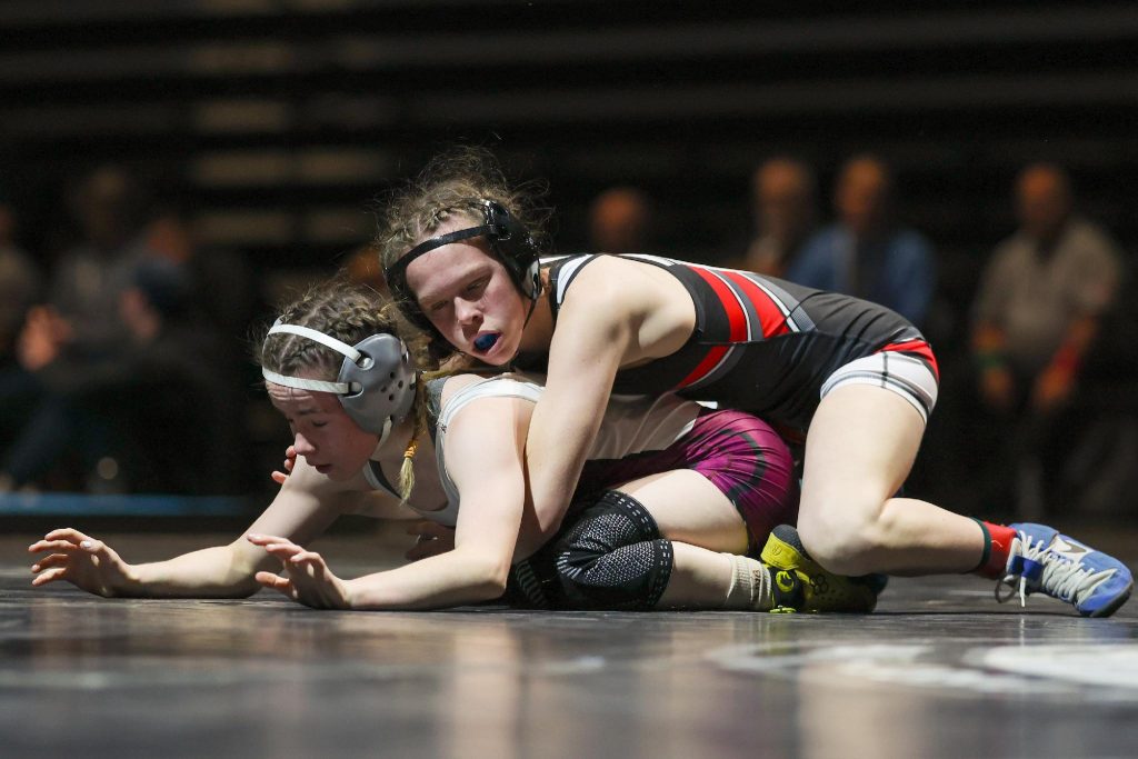 Uintah High’s Sadie Rhoades (105) wrestles Jordan High’s Abbey West (105) in the finals of the 2024 Utah 4A Girls State Wrestling Tournament at the UCCU Center in Orem, Utah, on Thursday, Feb. 15, 2024. Geoff Liesik/Uintah School District
