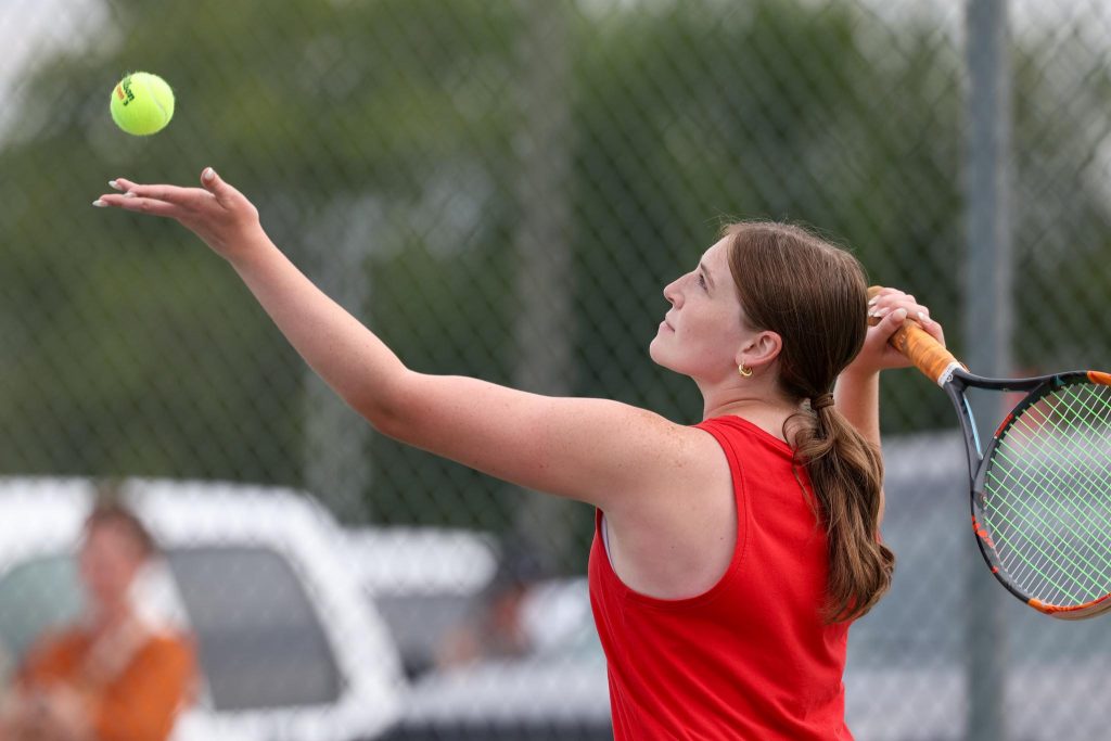 Uintah High’s Ava Petersen plays in a non-region third singles match against the Carbon High Dinos at UHS n Vernal, Utah, on Aug. 29, 2025.Geoff Liesik, Uintah School District